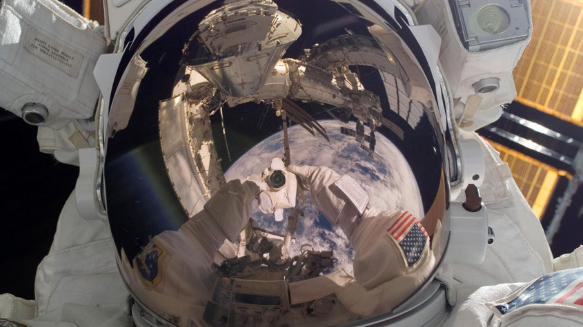 از زمان اولین سفرهای انسانی به فضا، فضانوردان همیشه دوربین هایی را برای ثبت تجربه برای همه افراد روی زمین حمل می کردند. در اینجا یک فضانورد در حین راهپیمایی فضایی یک عکس از خود می گیرد. (عکس از ناسا)
