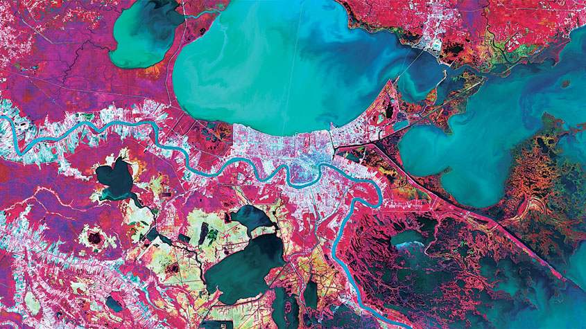 این تصویر که توسط Landsat 8 گرفته شده و توسط TellusLabs پردازش شده است، نیواورلئان را در امتداد خلیج مکزیک نشان می دهد. کشاورزی، عمدتاً نیشکر، در کنار سواحل می سی سی پی به رنگ صورتی روشن و آبی دیده می شود. همچنین چرخش های رسوبی در دریاچه پونتچارترین در شمال و از دست دادن زمین های ساحلی در جنوب و شرق شهر مشهود است. (عکس از ناسا)