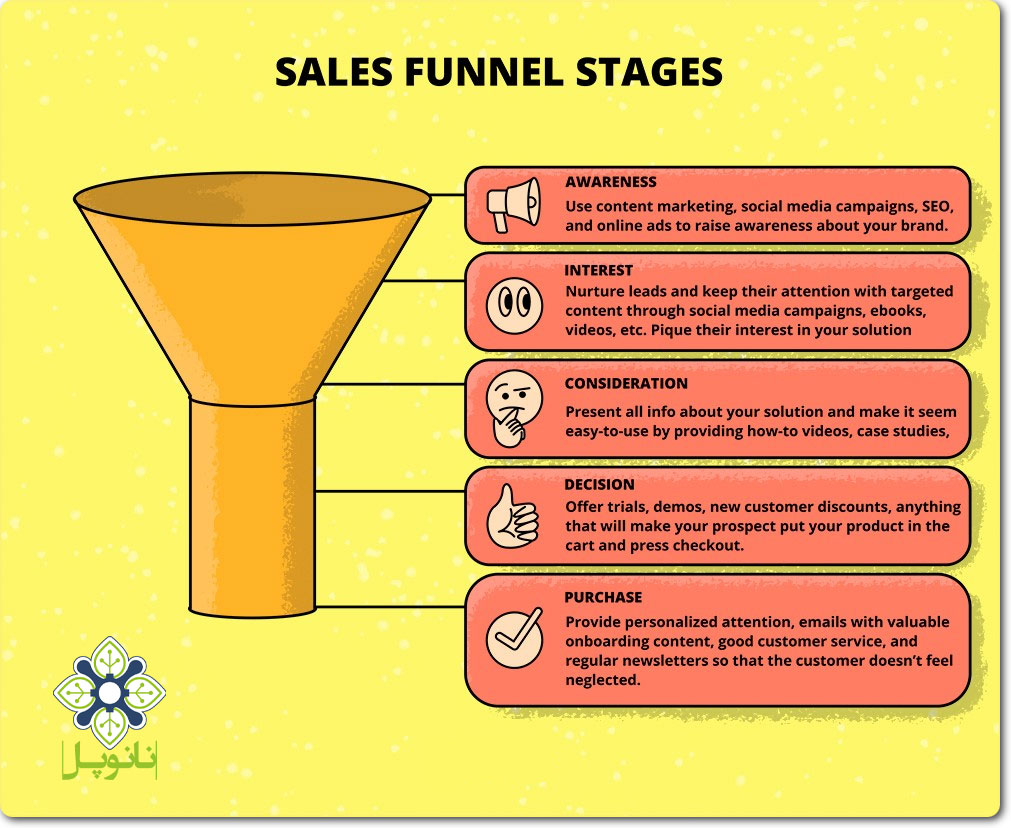 • خرید - تبریک، شما این کار را انجام دادید! مشتری بالقوه شما، مشتری شما شده است! کاری که اکنون باید انجام دهید این است که به تعامل با آنها و ارائه توجه شخصی ادامه دهید تا آنها خرید دیگری از شما انجام دهند.